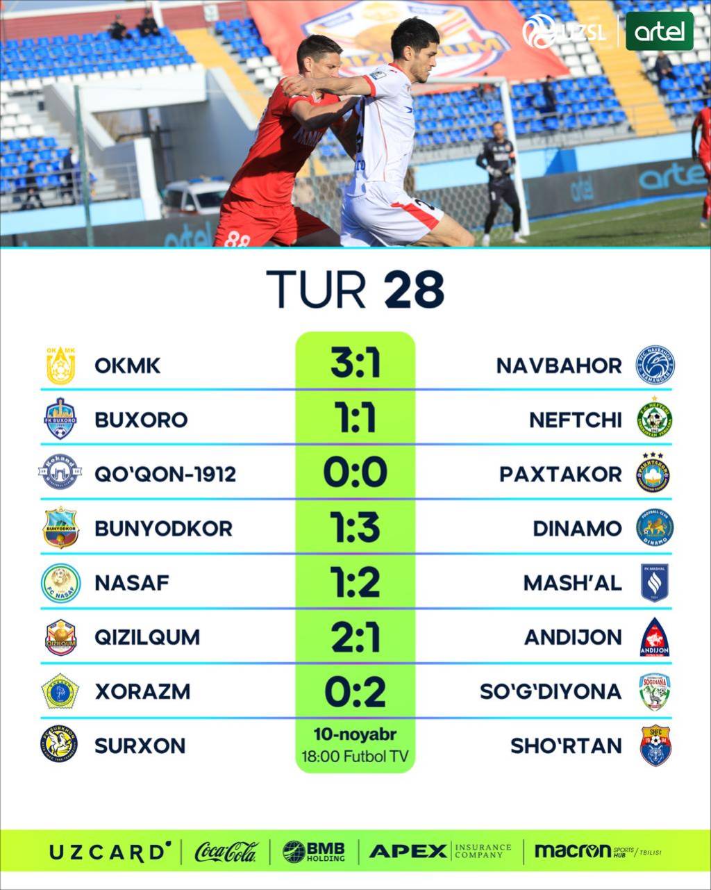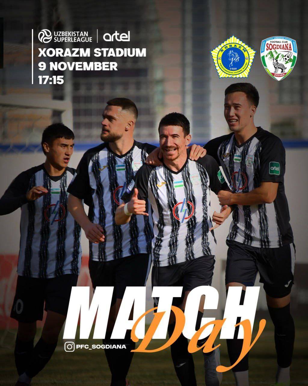 Футбол бўйича Ўзбекистон суперлигасининг 28-туридан ўрин олган “Хоразм” – “Сўғдиёна” баҳси Урганчдаги “Хоразм” стадионида бўлиб ўтди. Беллашув якунида жиззахликлар икки гол фарқи билан зафар қучди – 0:2.