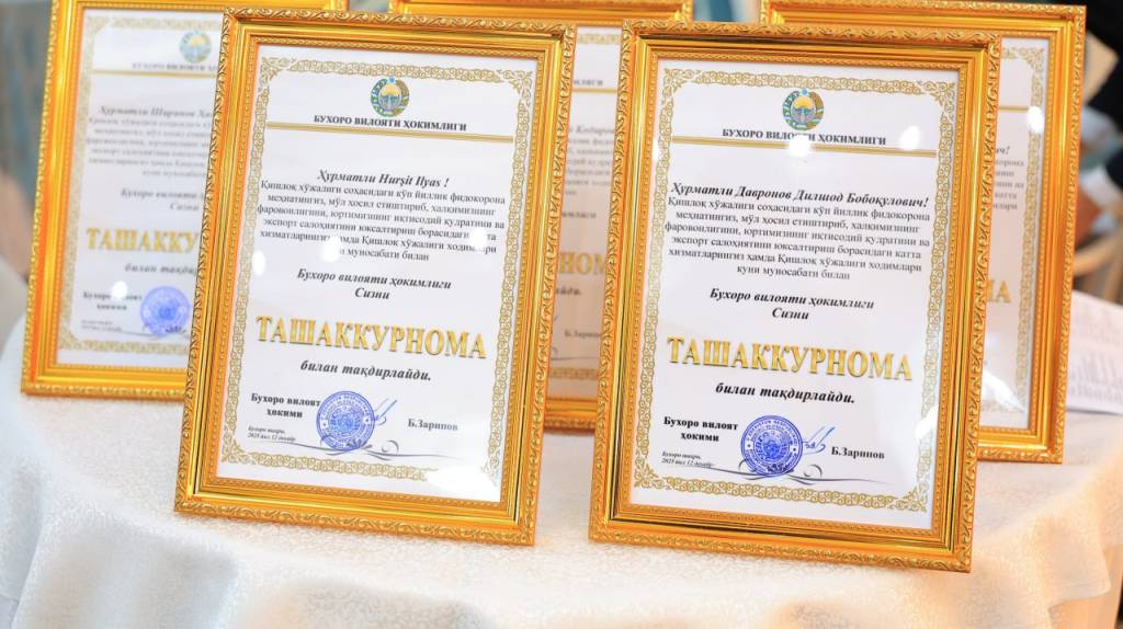 Ҳосил байрамида аграр соҳада фидойилик намунасини кўрсатаётган бир гуруҳ соҳа вакилларига “Ўзбекистон Республикаси қишлоқ хўжалиги фидоийси”, “Ўзбекистон Республикаси ветеринария фидойиси”, “Ўзбекистон Республикаси сув хўжалиги аълочиси”, “Илғор фермер” кўкрак нишонлари тантанали тарзда топширилди. “Бухара Варнет” масъулияти чекланган жамияти хорижий корхонаси таъсисчиси Хуршит Илясга “Фахрий фуқаро” мақоми берилганлиги тўғрисидаги гувоҳнома тақдим этилди.