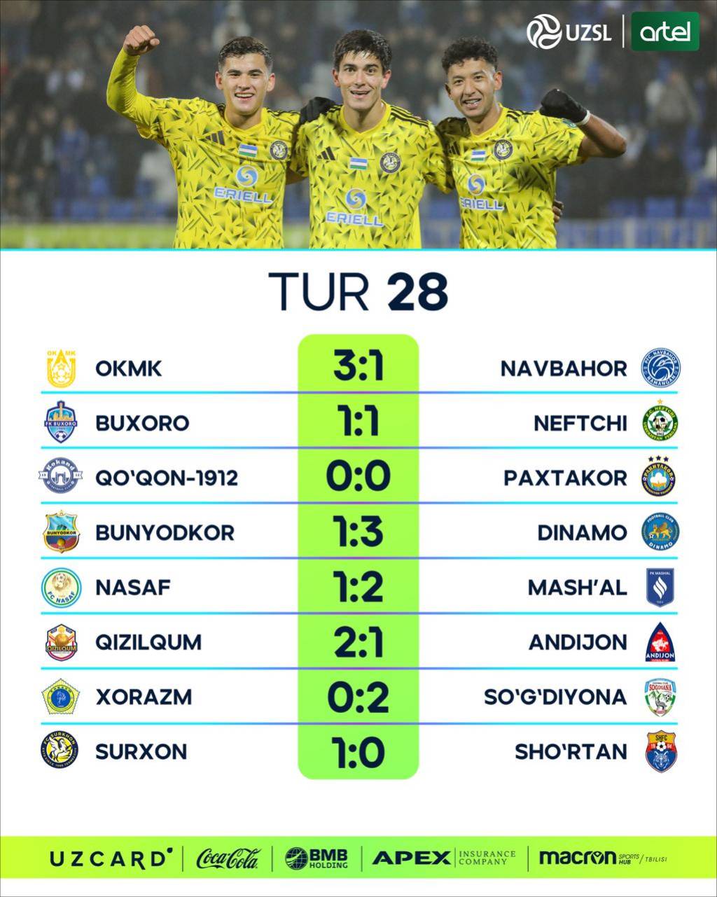28-тур якунига кўра, "Пахтакор" 56 очко билан учинчи поғонада қолди. Ўз ҳисобида битта захира ўйини бўлган "Динамо" 53 очко тўплаб тўртинчи бўлди. "Бунёдкор" эса 46 очко жамғариб, кучли бешликни якунламоқда. ОКМК очколарини 44 тага етказган бўлса, "Навбахор" 38, "Сўғдиёна" 37, "Қизилқум" 35, "Сурхон" 31 очко билан 6-10 ўринда қайд этилди. Шунингдек, 11-16 поғоналарда "Қўқон-1912", "Машъал", "Андижон", "Бухоро", "Хоразм" ҳамда "Шўртан" жой олган.