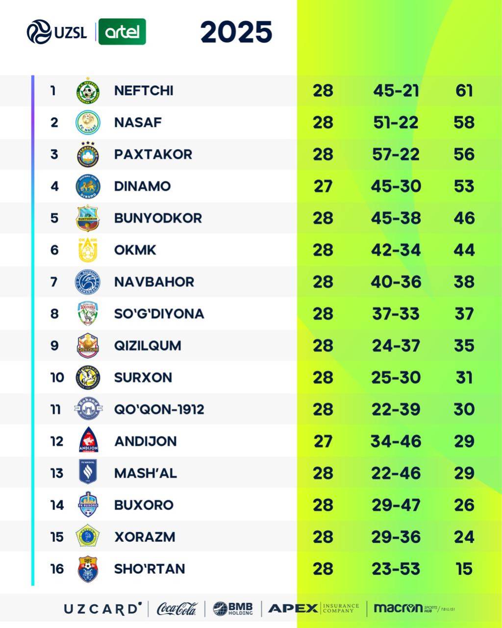Шу тариқа, кутилмаган натижаларга бой ўтган мазкур турда "Нефтчи" 61 очко билан пешқадамлигини янада мустаҳкамлаб олди. "Насаф" эса кутилмаган мағлубиятдан сўнг, 58 очко билан иккинчи ўринда қолди. “Нефтчи” келгуси турда 3 очкони қўлга кирита олса, миллий чемпионатимиз якунланишига битта тур қолганда мусобақа ғолибига айланади.