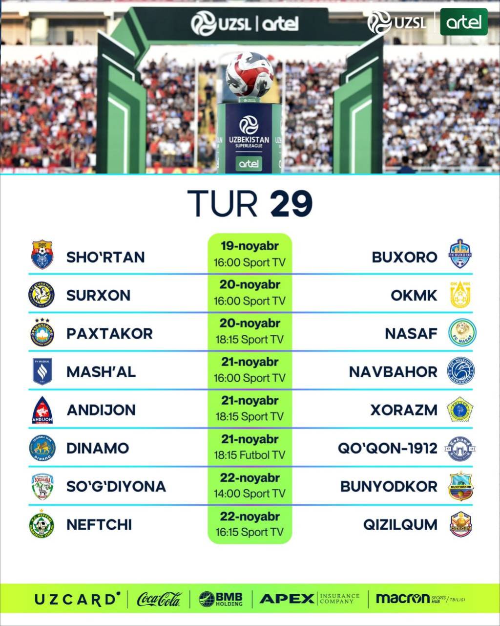 20 ноябрь: "Сурхон" — ОКМК, "Пахтакор" — "Насаф";