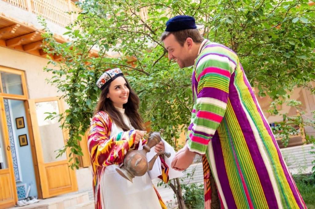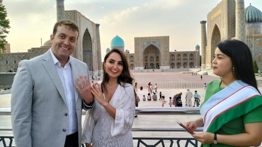 美国公民马歇尔·梅耶尔和埃布鲁·詹的婚礼在撒马尔罕的雷吉斯坦广场举行。