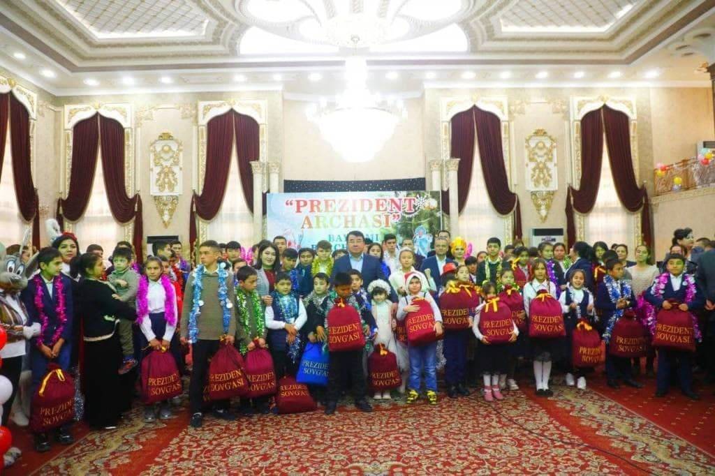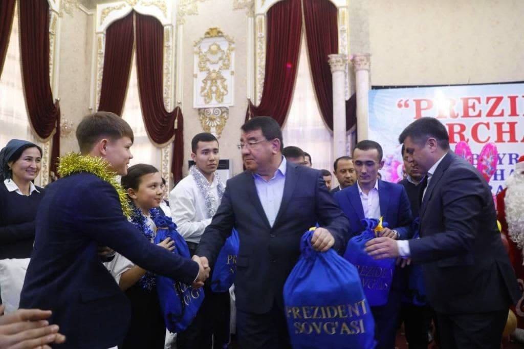 На торжественном мероприятии хоким Сурхандарьинской области Тура Боболов, заместитель начальника областного управления по поддержке махалли и семьи, сенатор Орзикул Соатов и другие поздравили детей с Новым годом от имени Президента, рассказали о заботе, оказываемой нашим государством для обеспечения счастливого будущего подрастающего поколения. Детям были вручены подарки Президента – школьные принадлежности, сладости и книги.