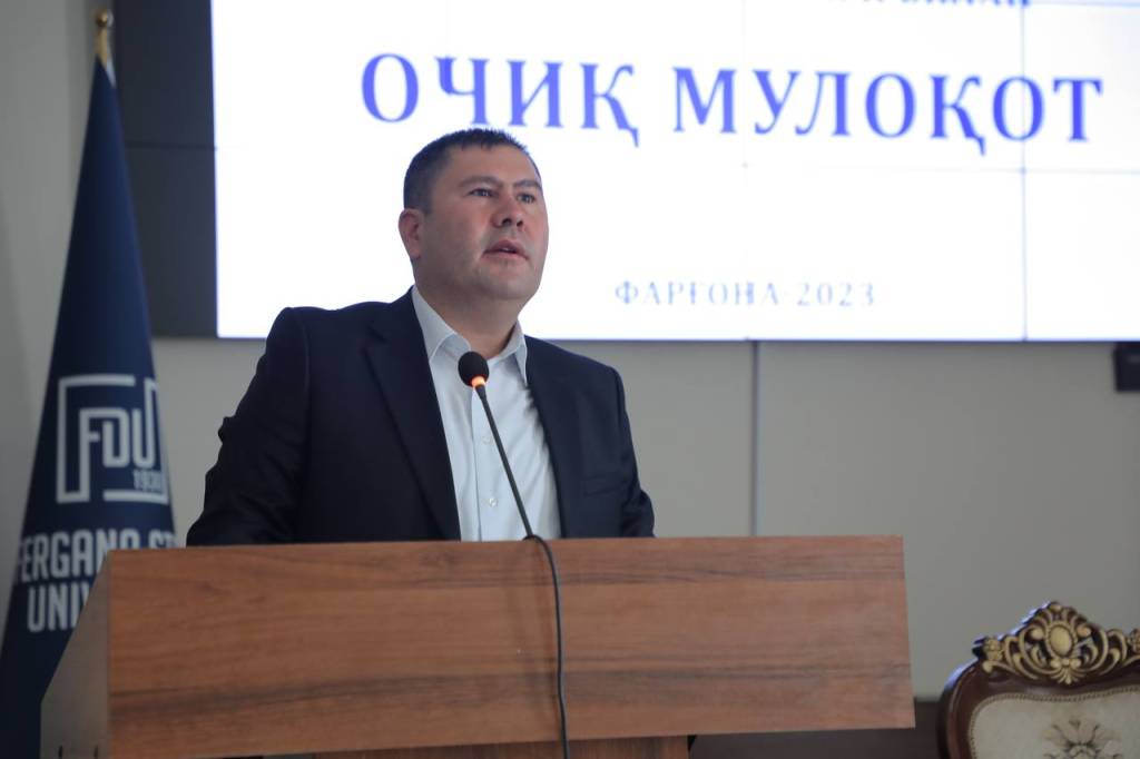 Шунингдек, сайёр қабул доирасида Фарғона давлат университетида вилоятдаги олий таълим муассасаларининг битирувчилари билан “Давлат хизматига очиқ йўл“ мавзусида очиқ мулоқот ўтказилди. Битирувчилар эртага олий даргоҳни тамомласак қаерга қандай тартибда ишга кира оламиз, деган саволларга жавоблар олди. Ачинарлиси, айрим ёшларимизда ишга киришда коррупцион ҳолатлар орқали ёки таниш билиш орқали давлат хизматига ишга кириш фикри ҳам йўқ эмас экан. Шу куни Давлат фуқаролик хизмати вакант лавозимларини ягона очиқ портали орқали ишга киришдаги шаффофлик ҳақида тушунчалар берилди. Очиқ мулоқот сўнгида битирувчи талаба-ёшлар учун давлат хизматига кириш учун ўз билим кўникмаларини синовдан ўтказишлари учун тест синов ҳам ўтказилди.