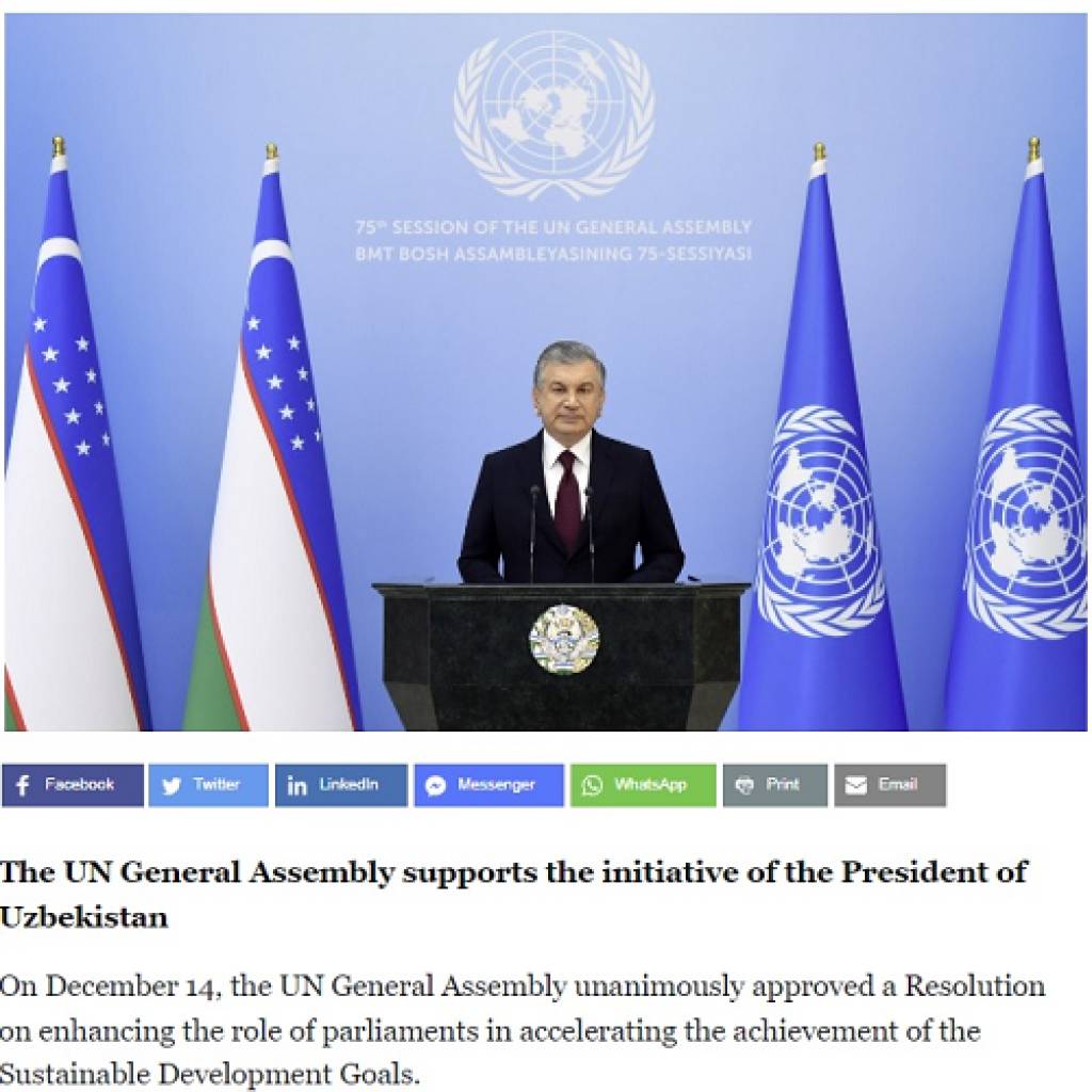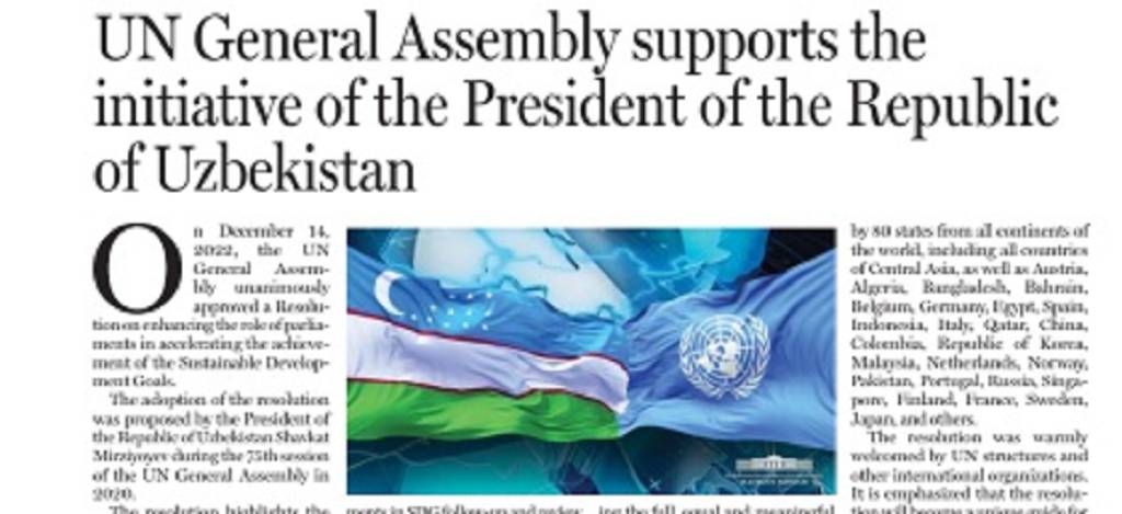Отмечается, что 14 декабря Генеральная Ассамблея ООН единогласно одобрила резолюцию «Об усилении роли парламентов в ускорении достижения Целей устойчивого развития (ЦУР)». Принятие резолюции было предложено Президентом Шавкатом Мирзиёевым в ходе 75-й сессии Генеральной Ассамблеи ООН в 2020 году.