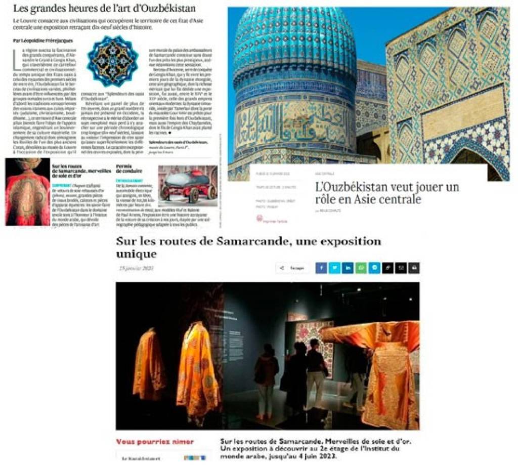 В частности, во французском журнале «Valeurs actuelles» была опубликована статья под заголовком «Великие времена искусства Узбекистана», а на интернет-портале «Vеridik» – «По дорогам Самарканда – уникальная выставка», на сайте «Revue Conflits» – «Узбекистан играет ведущую роль в Центральной Азии».Французская общественность с большим интересом читает о двух крупных выставках, посвященных истории и культурному наследию Узбекистана, которые проходят в Париже, а также растущей роли нашей страны на международной арене и участию республики в Шанхайской организации сотрудничества.