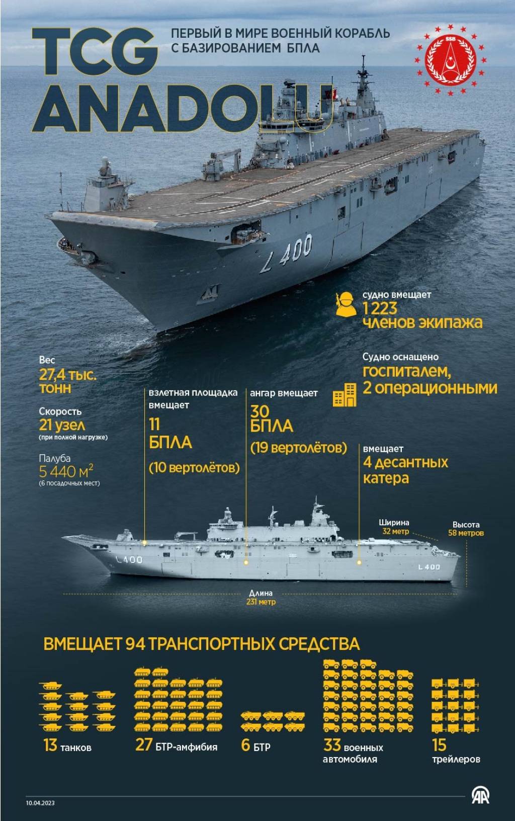 На палубе может размещаться 10 вертолетов и 11 беспилотников, емкость ангара – 19 вертолетов и 30 БпЛА. Сейчас на палубе уже размещены беспилотники компании Baykar Makina - Bayraktar TB3 и Kızılelma, а также боевой вертолет AH-1W Super Cobra. Anadolu был спущен на воду в 2019 году, приемные испытания закончились летом 2022 года.