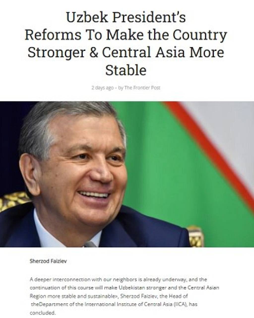 На сайте американо-пакистанской газеты «The Frontier Post» опубликована статья под названием «Реформы Президента Узбекистана сделают страну сильнее, а Центральную Азию стабильнее».