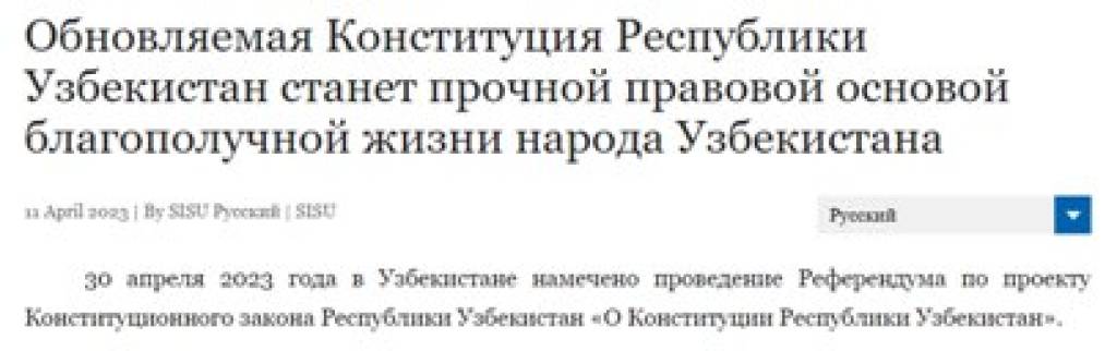 В публикации сообщается, что на 30 апреля в Узбекистане намечено проведение референдума по проекту Конституционного закона «О Конституции Республики Узбекистан». Как говорится в статье, в ходе всенародных обсуждений проекта Конституционного закона поступило 222715 предложений от граждан Узбекистана и каждое четвертое из них нашло свое отражение в проекте, который стал в буквальном смысле выражением воли народа.