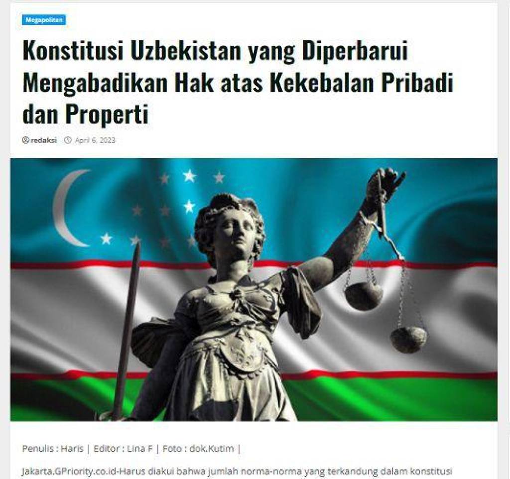 Популярное онлайн-информагентство Индонезии «Gpriority» опубликовало статью под заголовком «В обновляемой Конституции Узбекистана закреплено право на личную и имущественную неприкосновенность».