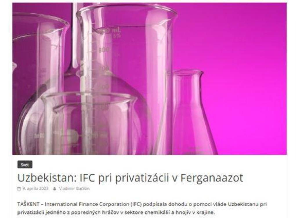 В статье генерального директора аналитического Центра «Comenius Analytica» и главного редактора издания «Финансовые новости» Владо Бачишина сообщается, что Международная финансовая корпорация (IFC) подписала соглашение с Агентством по управлению государственными активами Узбекистана об оказании содействия правительству страны в приватизации одного из ведущих предприятий в секторе химии и удобрений АО «Ферганаазот». В соответствии с соглашением IFC выступит в качестве стратегического советника по приватизации данного предприятия.