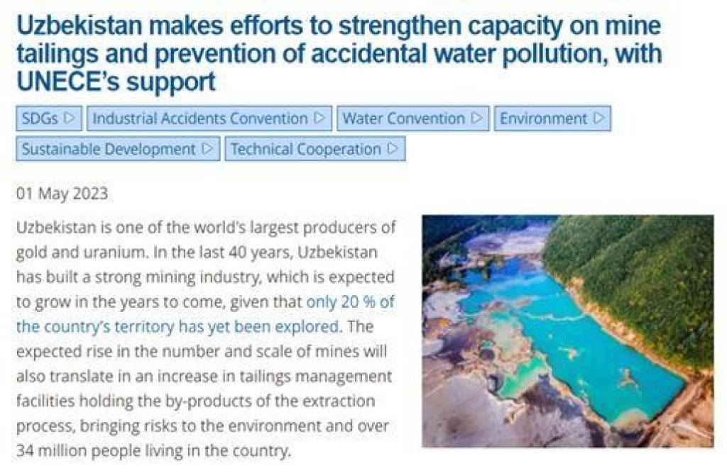 На сайте Европейской экономической комиссии (ЕЭК) ООН опубликована статья «Узбекистан прилагает усилия по укреплению потенциала хвостохранилищ и предотвращению аварийного загрязнения воды при поддержке ЕЭК ООН».