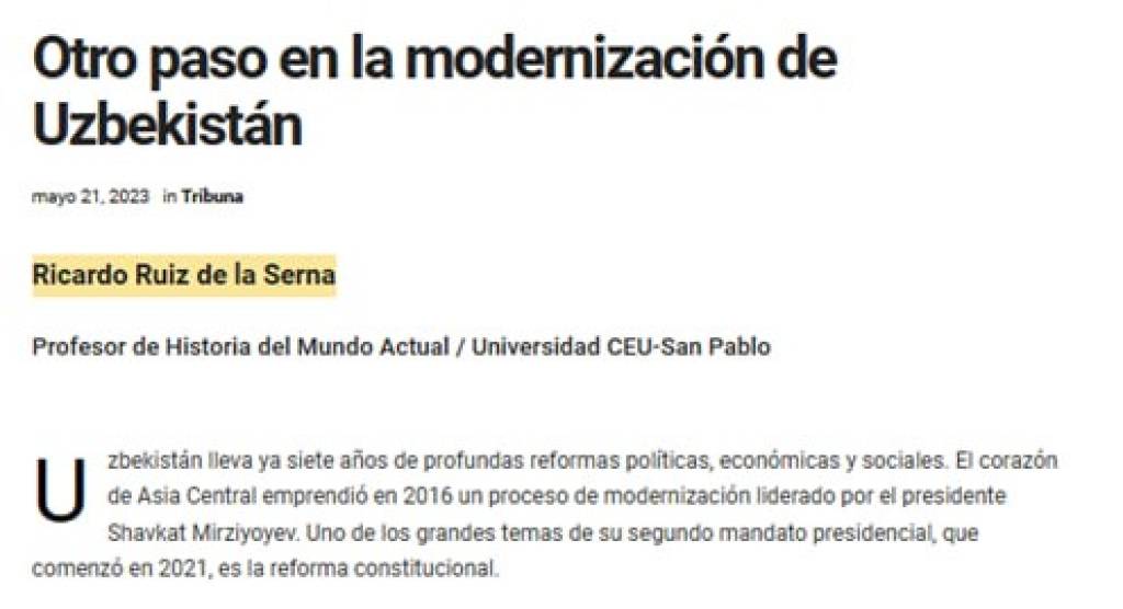 В ведущем испаноязычном международном онлайн-издании «The Diplomat in Spain» опубликована статья испанского политолога, профессора Университета «CEU-San Pablo» Рикардо Руиза де ла Серны под заголовком «Очередной шаг на пути модернизации Узбекистана».