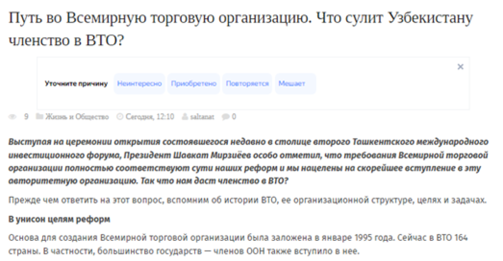 Популярный казахстанский интернет-журнал «Инфозакон» опубликовал статью под заголовком «Путь во Всемирную торговую организацию. Что сулит Узбекистану членство в ВТО?».