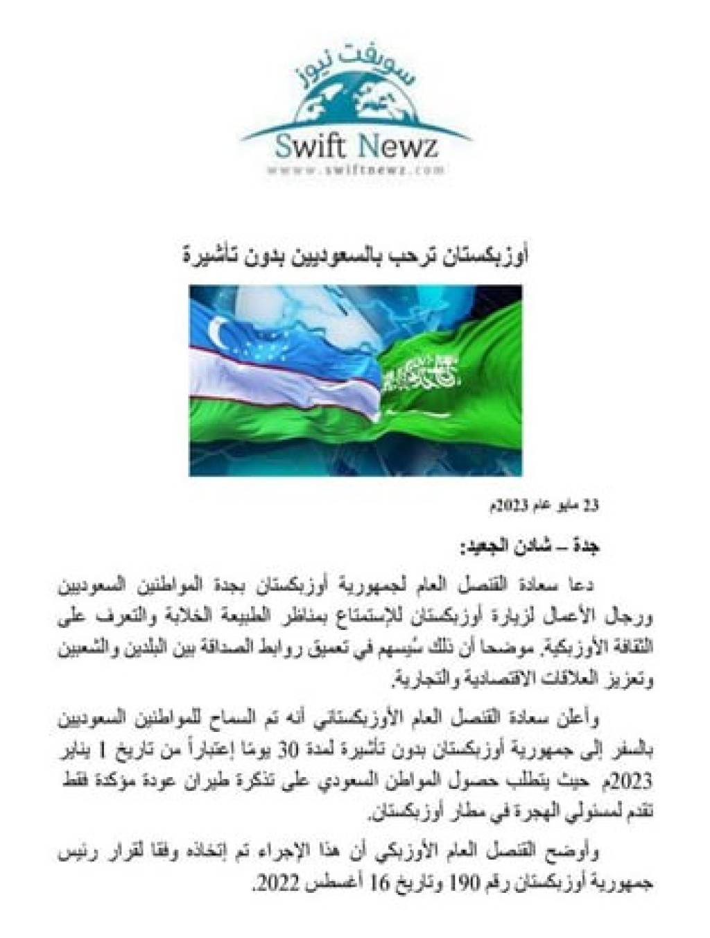 На страницах популярных электронных изданий Саудовской Аравии “Swift News” и “Ain Al-Naqal” опубликована статья “Узбекистан приветствует граждан Саудовской Аравии безвизовым режимом”.