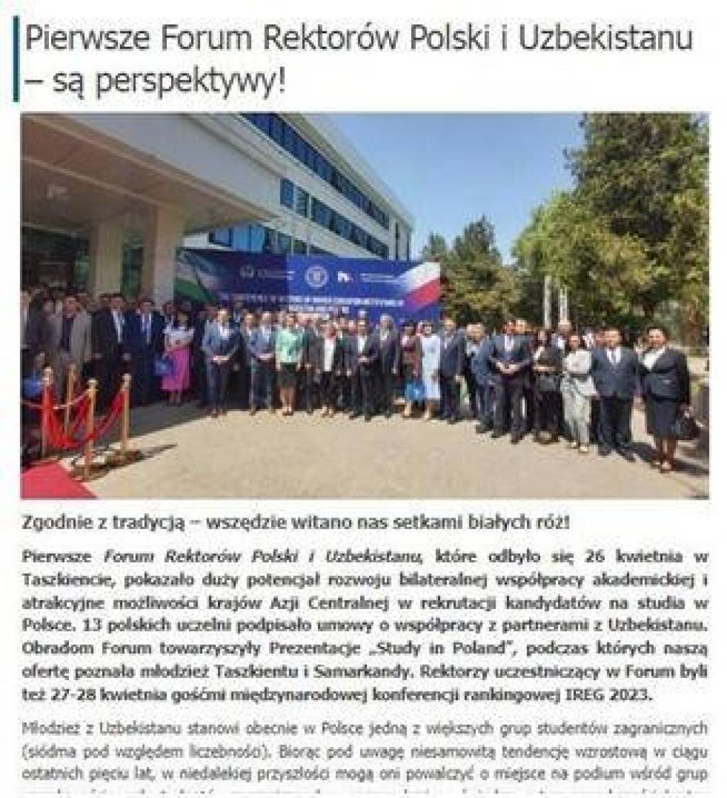 Автор статьи – президент Фонда «Perspektiwi» и главный редактор журнала профессор Вальдемар Сивинский, один из соорганизаторов Форума ректоров в Узбекистане, пишет, что мероприятие показало большой потенциал для развития двустороннего академического сотрудничества. Он сообщает, что 13 польских вузов подписали соглашения о сотрудничестве с партнерами в Узбекистане. Заседания Форума сопровождались презентациями на тему «Обучение в Польше», которые были представлены молодежи Ташкента и Самарканда. Ректоры - участники Форума - также стали гостями международной рейтинговой конференции IREG-2023, которая состоялась 27-28 апреля.