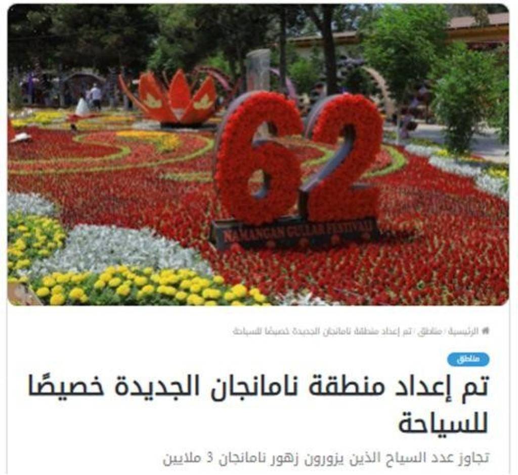 В статье отмечается, что число туристов, посетивших Фестиваль цветов в Намангане, превысило 3 миллиона человек. «За первые десять дней работы шестьдесят второго Фестиваля цветов этот город цветов посетили около 42 тысячи любителей цветов из 43 стран», - говорится в статье. Подчеркивается, что Наманган специально подготовился к этому грандиозному фестивалю, который находится в центре внимания туристов и любителей цветов со всего мира.