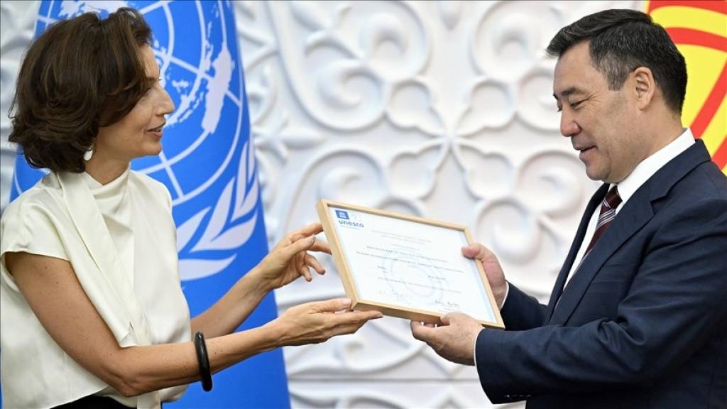 Она с удовлетворением подчеркнула активную позицию Кыргызстана в вопросах сотрудничества с ЮНЕСКО в деле сохранения культурного и исторического наследия человечества. В завершение встречи Азуле вручила Жапарову сертификат о включении рукописи эпоса "Манас" в варианте манасчы Сагымбая Орозбакова в список нематериального наследия.
