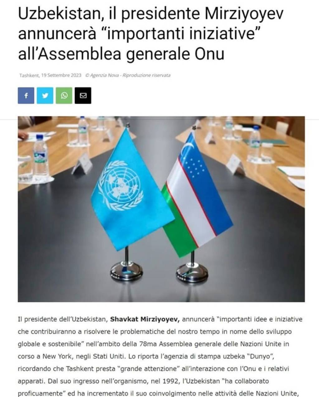 В итальянском онлайн-издании «Nova News» информационного агентства «Agenzia Nova» опубликована статья, посвященная выступлению Президента Узбекистана Шавката Мирзиёева на 78-й Генеральной Ассамблее ООН.