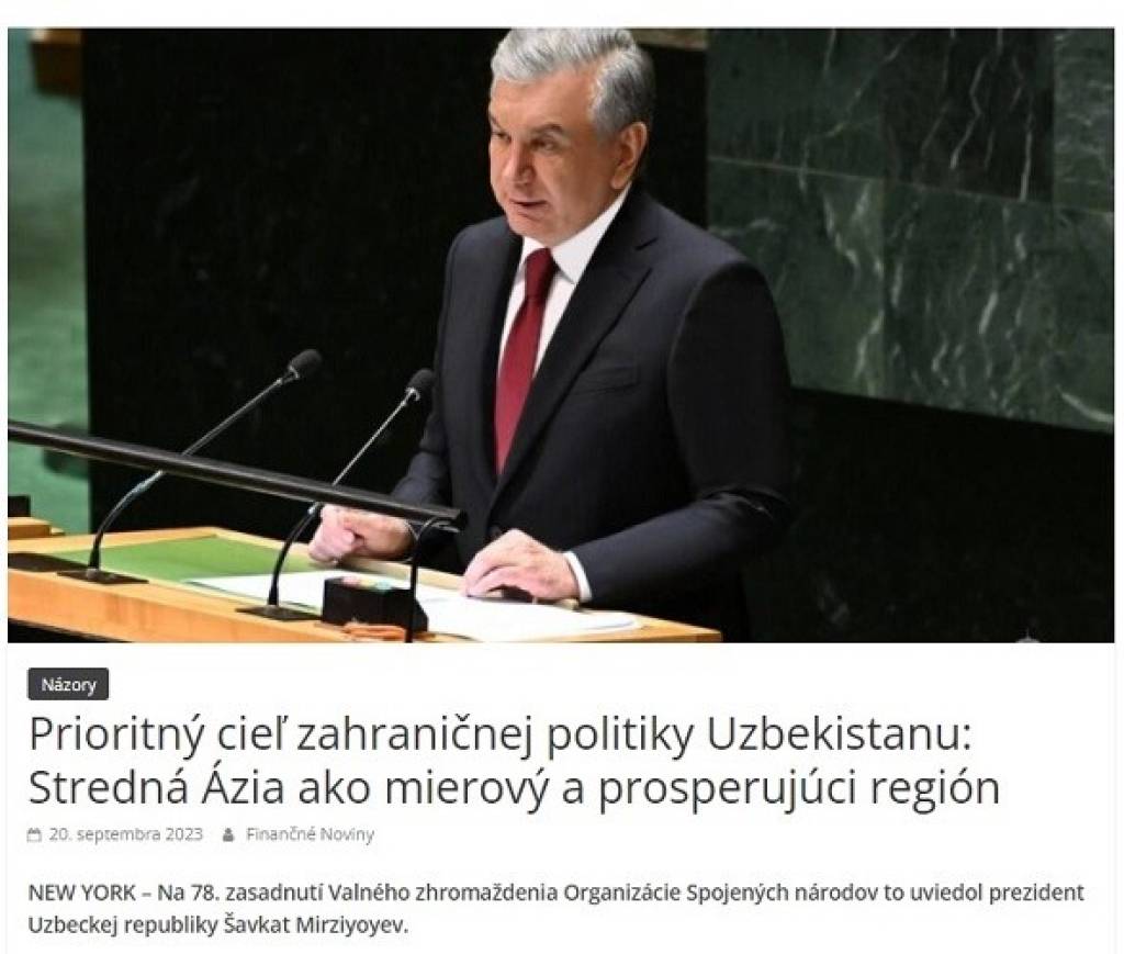В подготовленной генеральным директором аналитического Центра «Comenius Analytica» и главным редактором издания Владо Бачишиным статье отмечается, что Президент Узбекистана, выступая на 78-й сессии Генассамблеи ООН, призвал страны мира объединиться на основе того, что «общие интересы – выше существующих противоречий». Он упомянул о Самаркандской инициативе солидарности, которую официальный Ташкент выдвинул во имя общей безопасности и процветания.