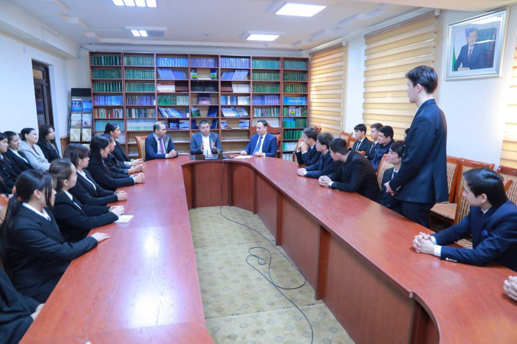 Viloyat sudi raisi o‘rinbosari Xurshid Tursunov, viloyat sudi sudyalari Feruz Karimov va Xurshid Ravshanov sud-huquq sohasida ishlash katta sharaf bo‘lishi bilan birga ulkan mas’uliyat talab qilishini, buning uchun kuchli bilim, kasbga sadoqat, fidoiylik talab qilinishini ta’kidladilar. Shuningdek, uchrashuvda O‘zbekiston Respublikasi Konstitutsiyasining qabul qilinishi va o‘tgan davr mobaynida unga kiritilgan o‘zgarishlar, ayni paytda amalda bo‘lgan Bosh qomusning yangi tahriri, undagi yangiliklar haqida batafsil ma’lumot berildi.