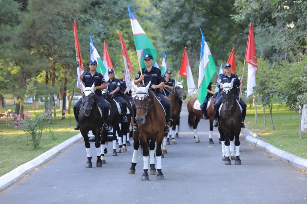 Tadbirda 100 dan ortiq otlar ishtirok etdi. Jamoat xavfsizligi universiteti harbiy orkestri ijrosidagi musiqa sadolari ostida chavandozlar xizmat va sport kiyimlarida, O‘zbekiston bayrog‘ini baland ko‘targan holda belgilangan manzillar bo‘ylab paraddan o‘tishdi.