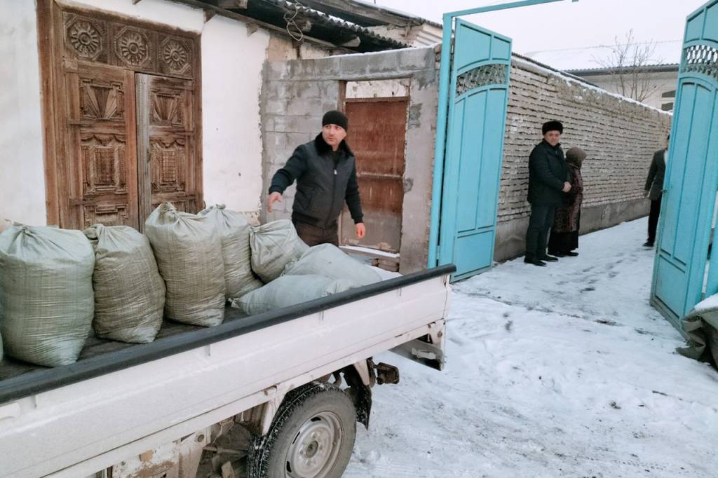 В эти морозные дни в Шахриханском районе Андижанской области представителям социально уязвимых слоев населения раздают уголь и продукты.