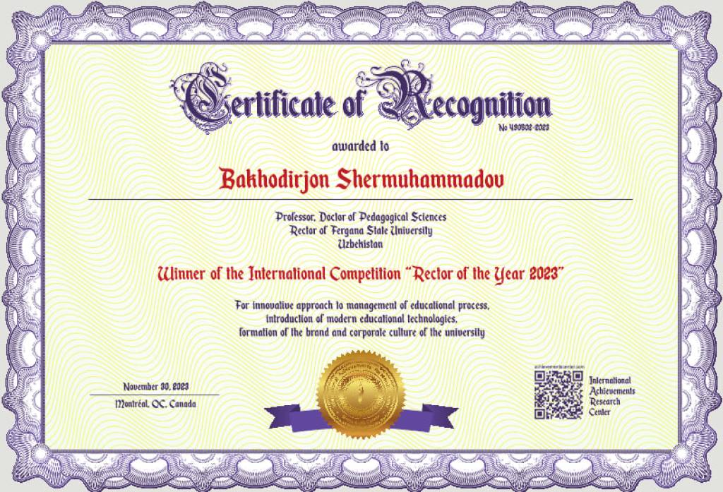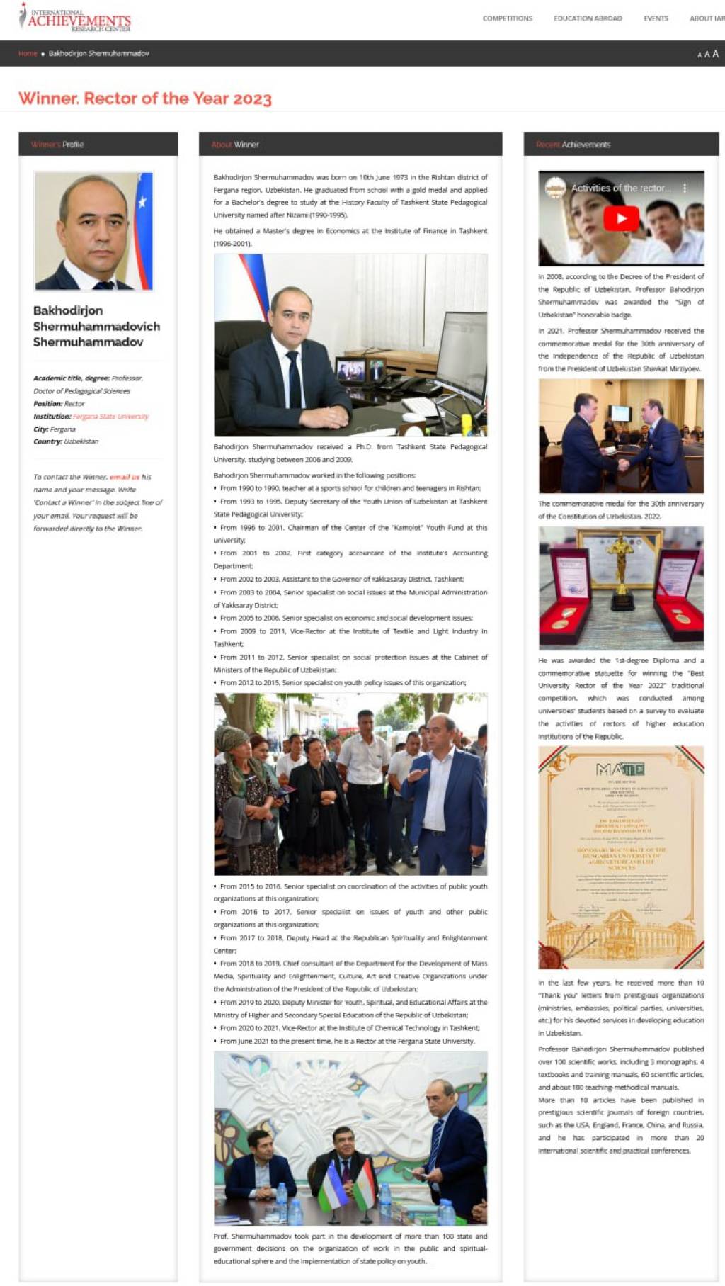 По решению авторитетных международных экспертов и членов жюри IARC, ректор Ферганского государственного университета, профессор Баходиржон Шермухаммадов по таким показателям, как инновационный подход к управлению, качественное образование и внедрение современных образовательных технологий, совершенствование научно-исследовательской деятельности, уровень качества учебно-технологического оборудования университета, высокий потенциал студентов в творческой и спортивной сфере, формирование корпоративной культуры в коллективе, признан победителем в рейтинге конкурса «Ректор года-2023». А Ферганский государственный университет по уровню стратегического, корпоративного и индивидуального развития стал победителем в номинации «Университет года-2023».