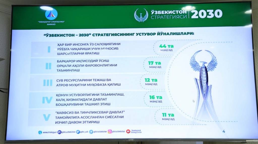 Стратегия «Узбекистан-2030» охватывает пять приоритетных направлений. Выдвинуто 100 важных целей, среди которых 44 цели направлены на создание подходящих условий для реализации каждым человеком своего потенциала, 17 – на обеспечение благосостояния населения посредством устойчивого экономического роста, 12 – на экономию водных ресурсов и защиту окружающей среды, 16 – на обеспечение верховенства закона, организацию государственного управления, направленного «на службу народу», 11 – на последовательное продолжение политики, основанной на принципе безопасного и миролюбивого государства.