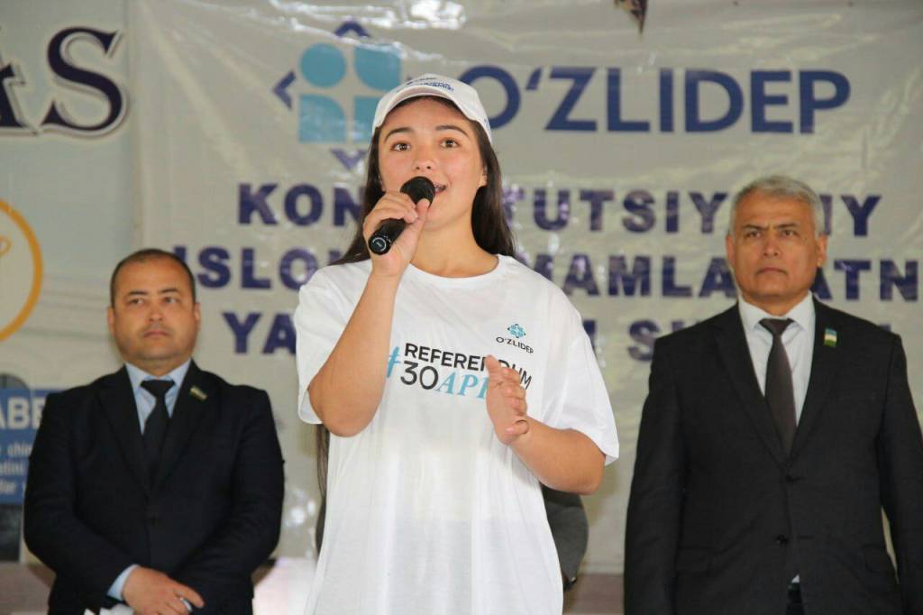 ЎзЛиДеП томонидан Музработ туманидаги истироҳат боғида ташкил этган "Янгиланаётган Конституция – бугуннинг талаби, эртанинг кафолати!" мавзуидаги тарғибот тадбирида турли соҳа вакиллари, фаол хотин-қизлар ва ёшлар иштирок этди. Унда Олий Мажлис Қонунчилик палатаси депутати Ботир Мардаев, ЎзЛиДеП Сурхондарё вилояти кенгаши раиси Алишер Рўзиев ва бошқалар бугун жамиятимизда юз бераётган ўзгаришларга мос янгиланиши талаб этилган Бош Қомусимиз эртанги янада осуда, обод ва фаровон ҳаётимизнинг ишончли кафолати бўлишини таъкидлади.
