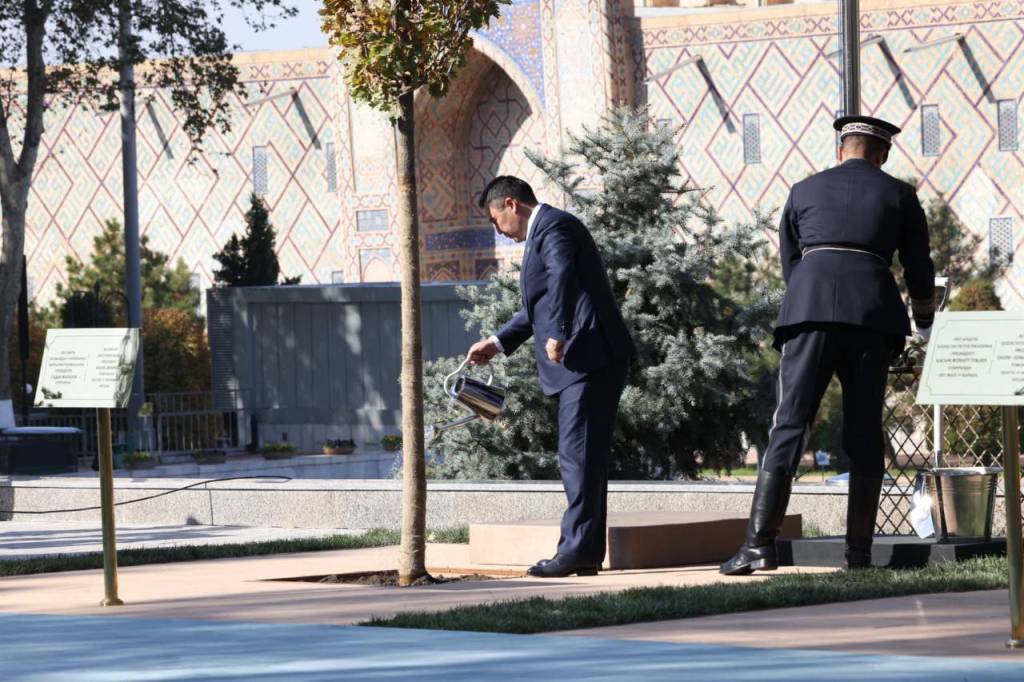 Регистан алаңында Түркі мемлекеттері ұйымының Самарқанд саммиті аясында ұйымға мүше және бақылаушы елдердің Мемлекет басшыларының қатысуымен «Жасыл кеңістік» жобасы аясында көшет отырғызу шарасы өтті.
