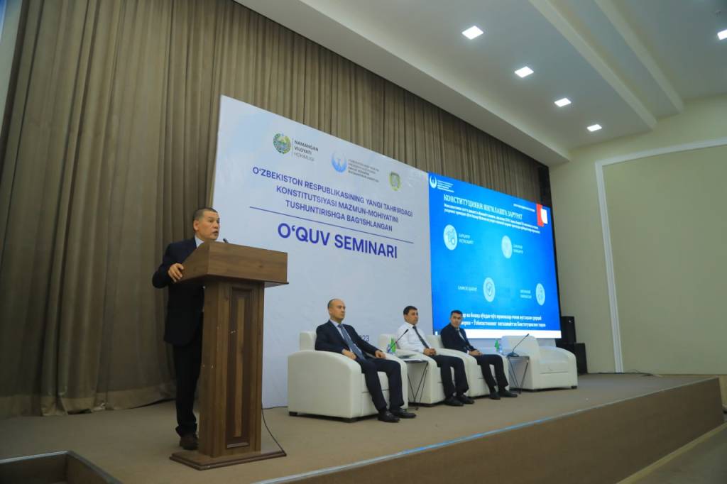 Seminarda Prezident huzuridagi Davlat xizmatini rivojlantirish agentligi Namangan viloyati filiali rahbari o‘rinbosari Otabek Rahimov 2023 yil 30 aprelda o‘tkazilgan O‘zbekiston Respublikasi referendumida umumxalq ovoz berish orqali qabul qilingan, joriy yilning 1 mayidan kuchga kirgan yangi tahrirdagi Bosh qomusimizda belgilangan konstitutsiyaviy normalarning ijrosini so‘zsiz ta’minlash barcha sohalarda inson qadrining tom ma’noda yuksalishiga, davlat va jamiyat hayotini “inson – jamiyat – davlat” degan tizimga asoslangan zamonaviy tarzda boshqarish imkoniyatini berishini ta’kidladi.