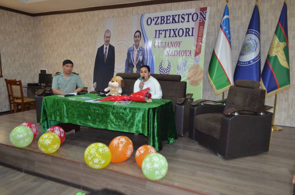 Учрашув давомида ҳарбий хизматчилар ўзларини қизиқтирган саволларга жавоблар олди. Гулжаной Наимованинг имзоли чарм қўлқопи ҳарбий қисмга эсдалик сифатида топширилди. Тадбир якунида ҳарбий қисм қўмондонлиги томонидан спорт устасига фахрий ёрлиқ ва эсдалик совғалари топширилди.