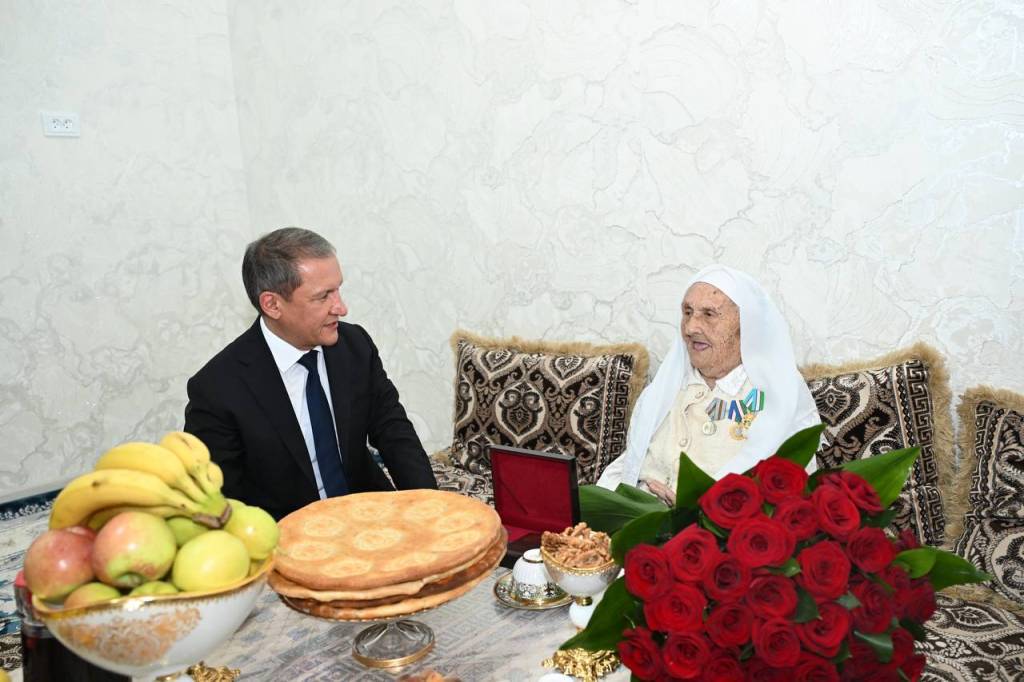 Глава региона Журабек Рахимов навестил Назибу момо, торжественно вручил ей награду и обсудил с ней изменения, происходящие в стране.