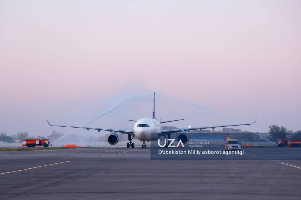 В Самаркандском международном аэропорту приземлился самолет Airbus A330-300 — первый во флоте новой авиакомпании Air Samarkand. Воздушное судно встретили традиционной водной аркой.