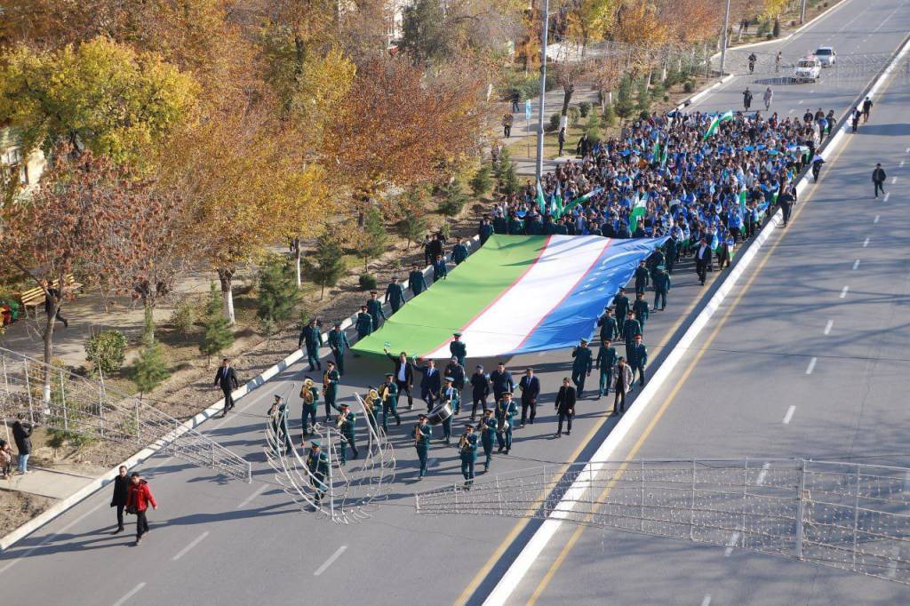 По случаю принятия Государственного флага Республики Узбекистан по всей стране реализуется уникальный проект. Организаторы - Республиканский центр духовности и просветительства, Ассоциация махаллей Узбекистана, Агентство по делам молодежи, Министерство обороны и Национальная гвардия Узбекистана. Наш рекордный стометровый флаг проносят через всю страну. Это событие вызывает гордость у каждого соотечественника. Отважные воины, молодежь и патриотически настроенные жители несли его в Хорезмской области, Ичан-Кале, Арк-Кале, по историческим улицам древнего и неизменно популярного Самарканда, через славный Джизак, оазисы и долины. Скоро флаг можно будет увидеть в столице.