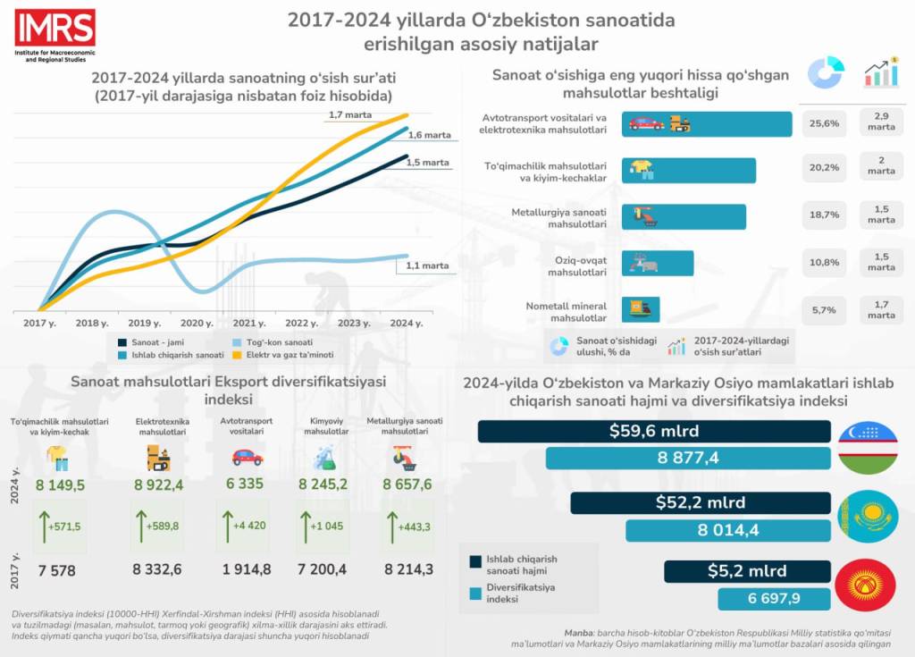 Согласно анализам экспертов Института макроэкономических и региональных исследований (ИМРИ) при Кабинете Министров Республики Узбекистан, за 2017-2024 годы в промышленности наблюдалось устойчивое развитие. Так, промышленное производство ежегодно увеличивалось в среднем на 6,2 %, а в целом за период возросло более чем в 1,5 раза. Это позволило сделать промышленность ключевым «драйвером» экономического роста. Доля промышленности в структуре ВВП возросла с 22,2 % в 2017 году до 26,4 % в 2024 году.
