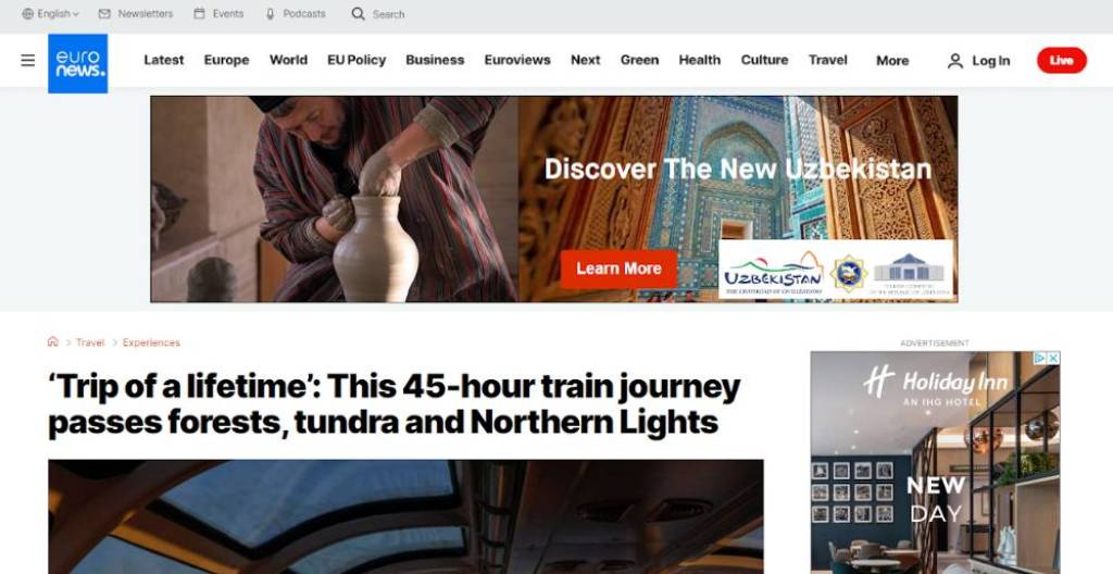 Совместно с Центром исламской цивилизации при Кабинете министров Республики Узбекистан, Комитетом по туризму и компанией Uzbekistan Travel медиагигант разработал и опубликовал серию статей и видеосюжетов, рассказывающих о культурных и экономических преобразованиях в стране. Одной из ярких публикаций стала программа Euronews о путешествии по Великому шелковому пути, которая познакомила зрителей с историей древних узбекских городов, включая Самарканд и Бухару. Зрителям предлагалось проследовать по уникальному туристическому маршруту на скоростном поезде «Афросиаб», побывать в исторических местах и узнать о многовековых традициях виноделия в Багизагане.