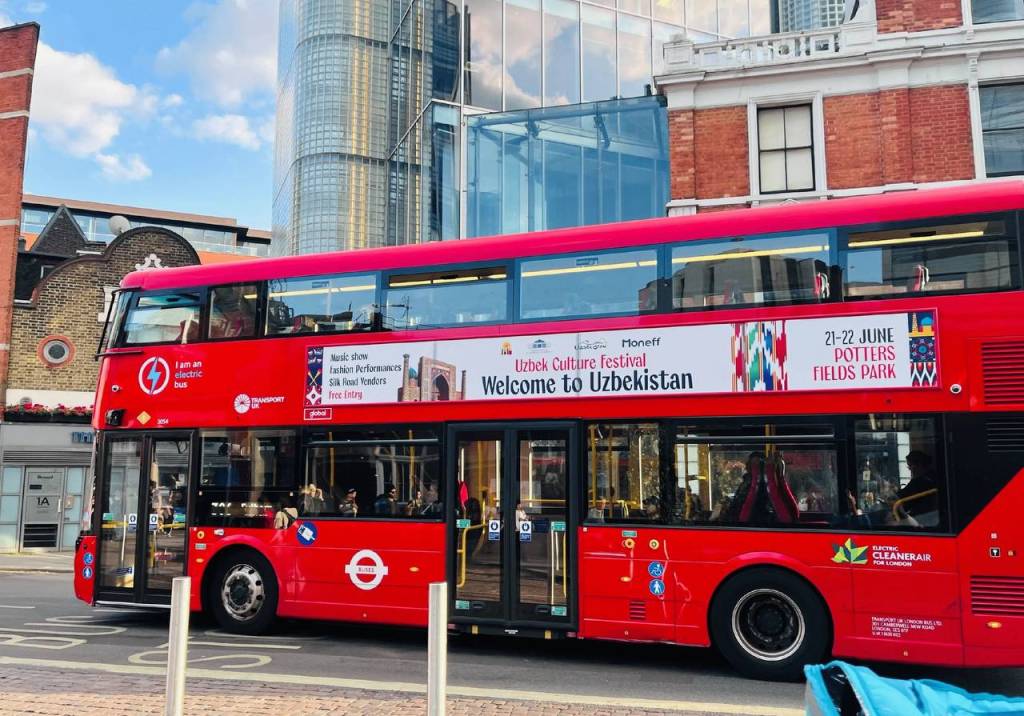 На улицах Лондона появились двухэтажные автобусы с яркими баннерами «Добро пожаловать в Узбекистан».