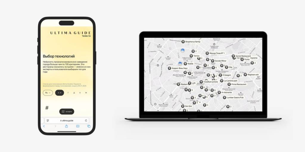 Сервис Ultima Yandex Go представил лонг-лист ресторанов-претендентов на включение в Ultima Guide – первый ресторанный гид по Ташкенту, созданный с использованием высоких технологий. С помощью нейросети сервис отобрал 140 ресторанов, которые нравятся гостям, отличаются оригинальной концепцией и качеством еды. Топ-20 заведений из списка попадут в Ultima Guide.