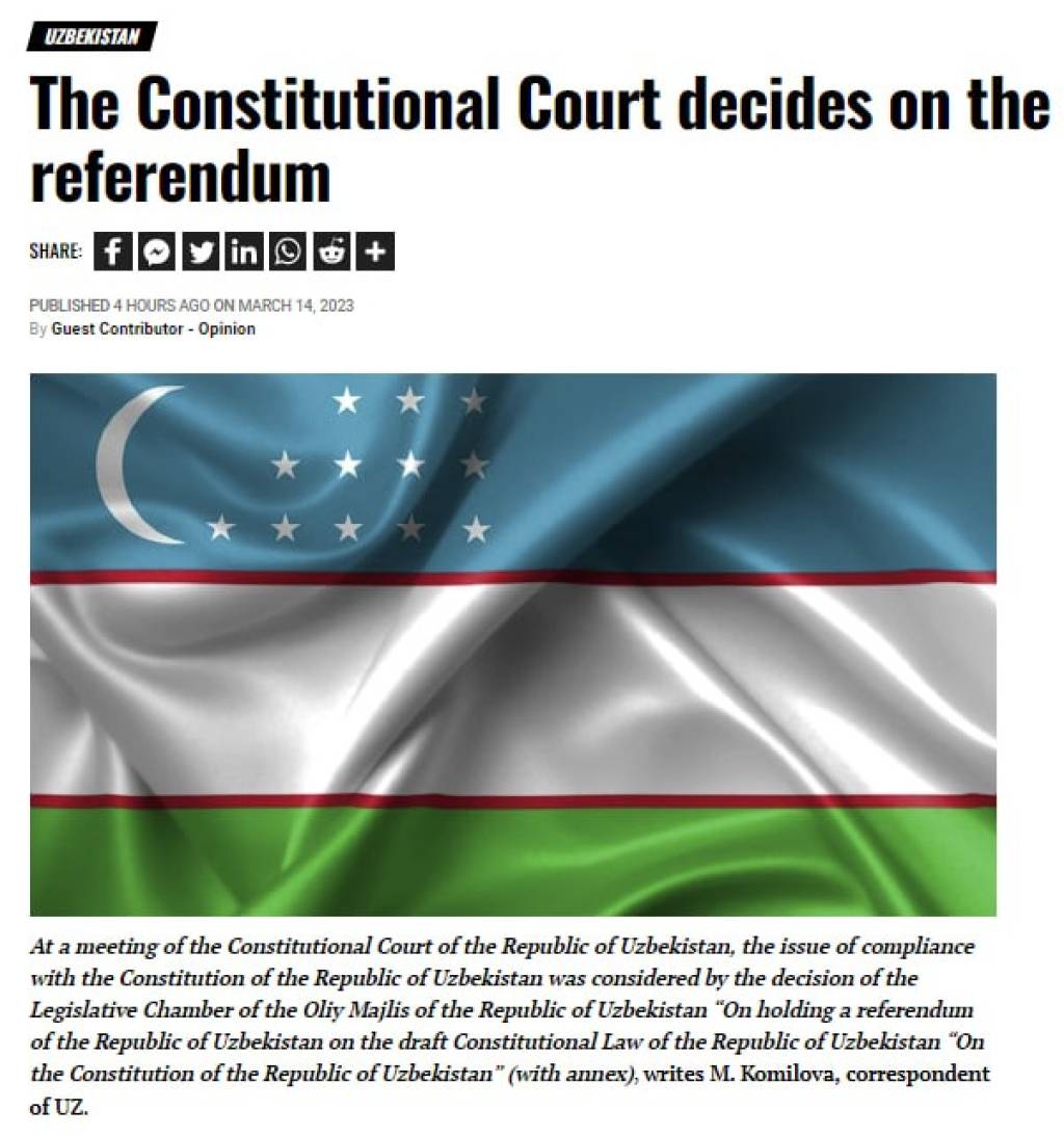 «Согласно постановлению Конституционного суда, принятое 10 марта решение Законодательной палаты Олий Мажлиса «О проведении референдума Республики Узбекистан по проекту Конституционного закона Республики Узбекистан «О Конституции Республики Узбекистан» (с приложением) соответствует Конституции Республики Узбекистан, - пишет «EU Reporter». - Обстоятельств, препятствующих вынесению проекта Конституционного закона на референдум, не выявлено. Вынесение проекта Конституционного закона на референдум признано соответствующим Конституции». Решение Конституционного суда будет направлено в Законодательную палату и Сенат Олий Мажлиса, заключает Европейский информационно-аналитический портал.