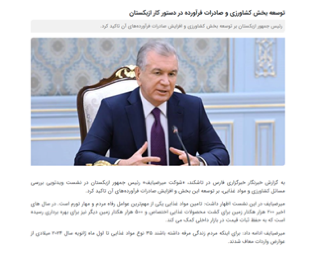 Ведущее иранское информационное агентства «Fars News» опубликовало статью под заголовком «Развитие аграрного сектора и экспорта продукции в повестке дня Узбекистана”.