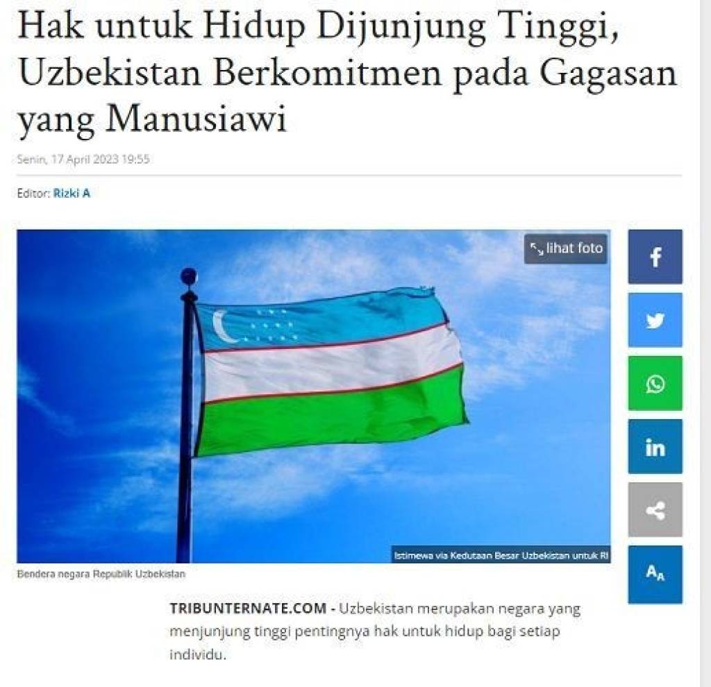 ДЖАКАРТА. Популярное информагентство Индонезии «Tribun News» опубликовало статью под заголовком «Право на жизнь защищено, Узбекистан привержен гуманным идеям».