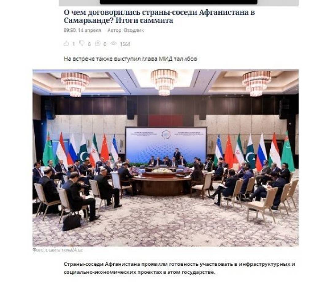 В статье сообщается, что в Самарканде под председательством Узбекистана состоялась четвертая министерская встреча соседних с Афганистаном стран, в которой приняли участие министры иностранных дел Узбекистана, Ирана, Пакистана, России, Таджикистана, Туркменистана и Китая. «В ходе форума стороны обсудили текущую ситуацию в Афганистане и выполнение основных требований международного сообщества нынешними властями этой страны, таких как формирование инклюзивного правительства, возможности трудоустройства и образования для афганских женщин, а также предоставление прав национальным меньшинствам, ‑ говорится в публикации. ‑ Была подчеркнута необходимость разработки механизма совместных действий, направленных на оказание гуманитарной помощи народу Афганистана и восстановление национальной экономики страны».