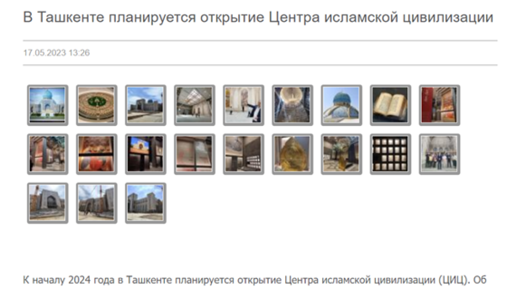 В статье отмечается, что к началу 2024 года в Ташкенте планируется открытие Центра исламской цивилизации (ЦИЦ). «Строительство центра ведется на площади 7 гектаров на территории знаменитого комплекса Хазрати имам (Хастимом) в Алмазарском районе Ташкента последние пять лет, - пишет автор. - Уже выполнена большая часть строительных работ, которые могут быть завершены к концу текущего года».