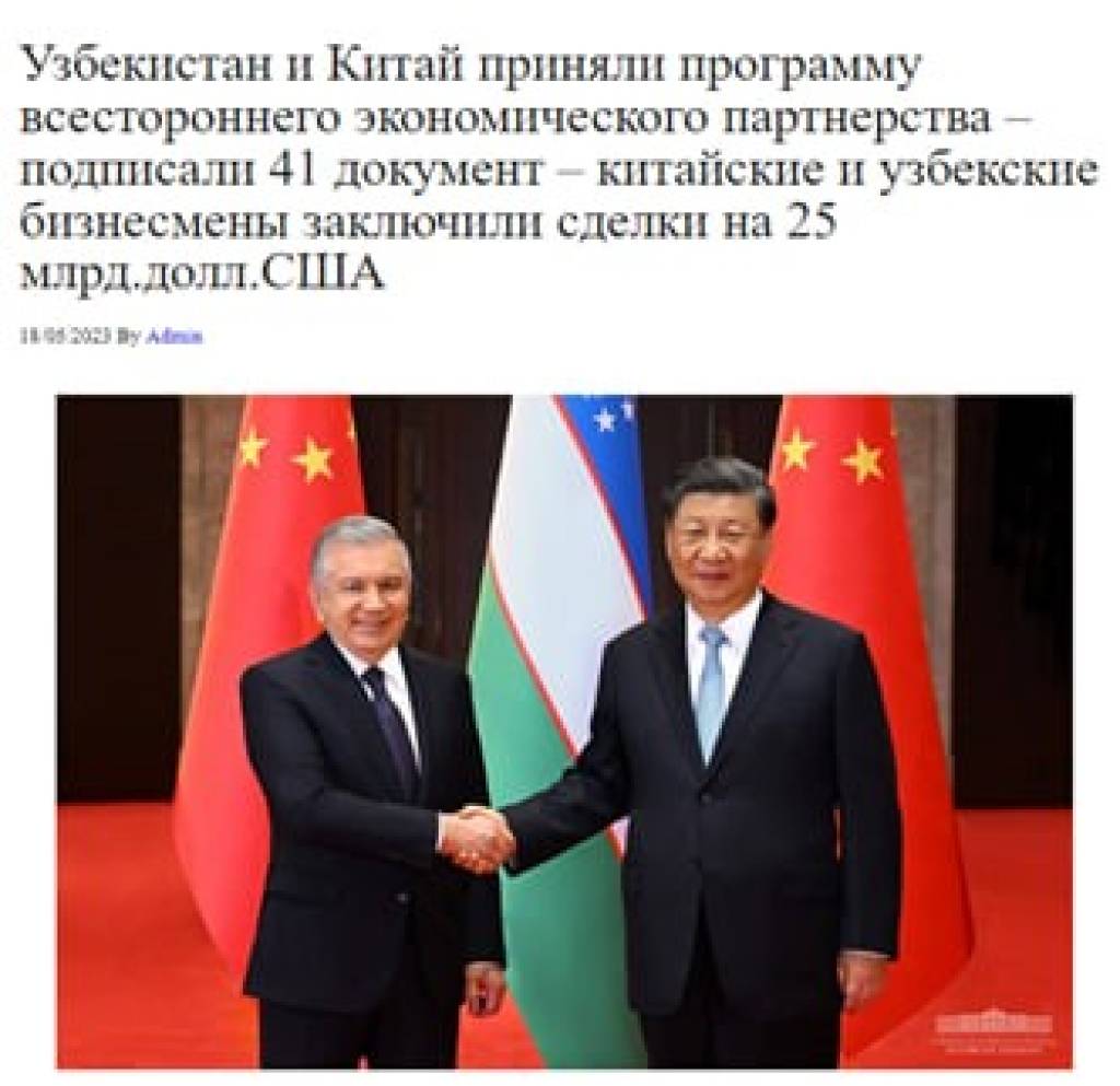 Так, портал информирует, что 18 мая в Сиане состоялись переговоры между Президентом Шавкатом Мирзиёевым и Председателем Си Цзиньпином, завершившиеся подписанием 41 документа.