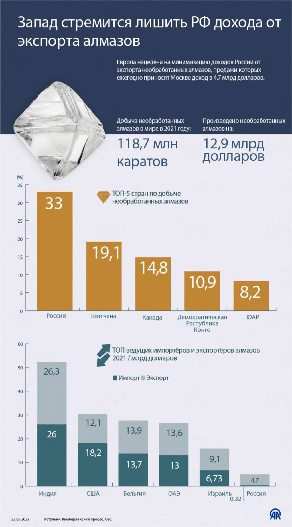 Как сообщает «Анадолу» со ссылкой на данные KPCS, по итогам прошлого года Россия возглавила список экспортеров необработанных алмазов. На ее долю пришлось 33 процента (39,1 млн карат) необработанных алмазов, произведенных в 2022 году. До 90 процентов производства российских алмазом пришлось на горнодобывающую компанию «Алроса», которая в настоящее время включена в санкционные списки Канады, Великобритании, США, Новой Зеландии и Багамских островов.