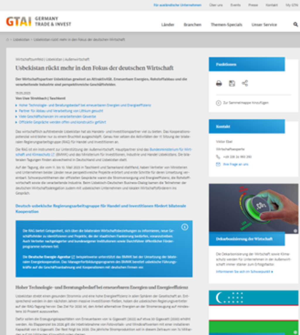 Агентство по внешней торговле и инвестициям Германии («Germany Trade & Invest»/GTAI) опубликовало на своем портале статью под заголовком «Узбекистан все больше привлекает внимание немецкой экономики», посвященную экономическим преобразованиям в нашей стране.