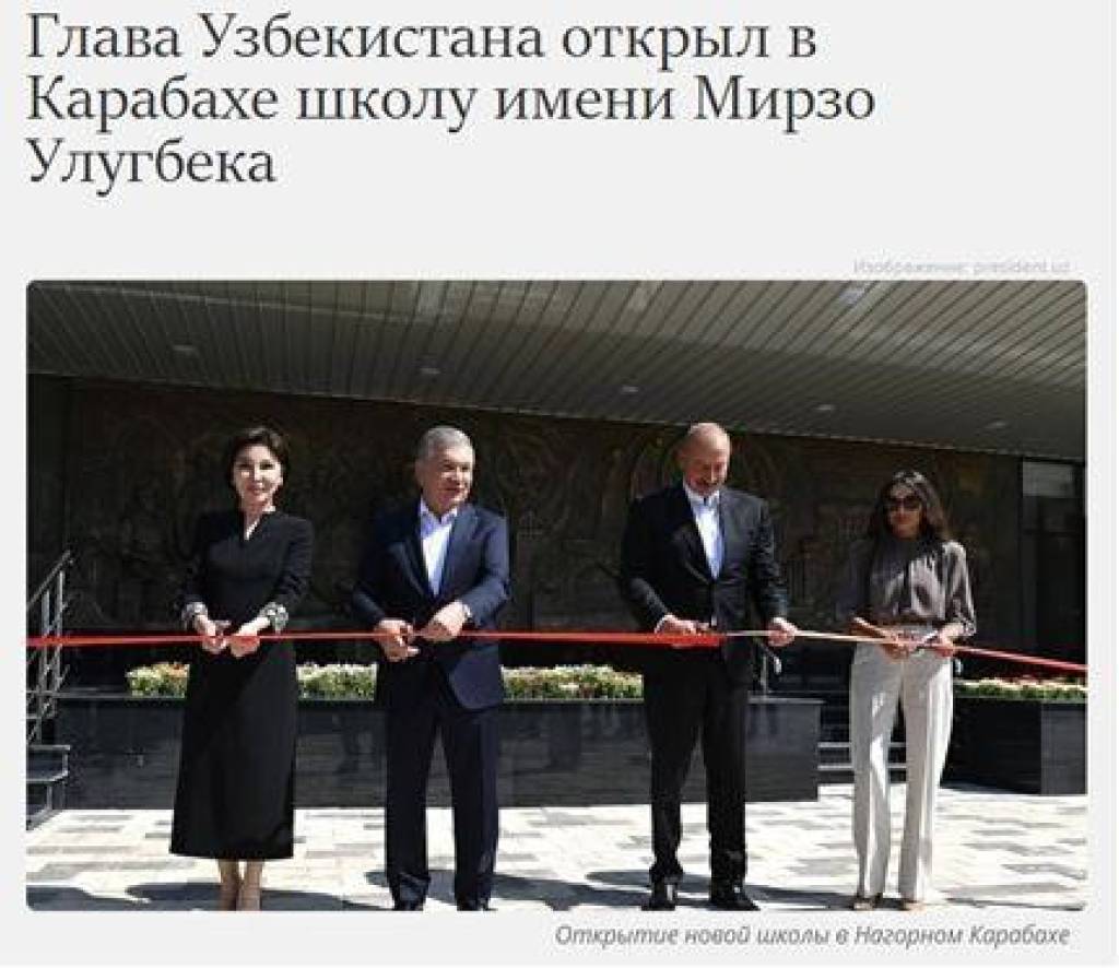 Информагентство «Красная весна» отмечает, что глава Узбекистана открыл в Карабахе школу имени известного астронома, математика и ученого-энциклопедиста Мирзо Улугбека. «В школе предусмотрено шесть лабораторий, два кабинета информатики и пять функциональных учебных кабинетов, ‑ говорится в статье. ‑ Данная школа является доказательством того, что Узбекистан в трудный для Азербайджана период как сосед помогает ему, приобщая детей к богатой истории и культуре Узбекистана, и творчеству общих предков».