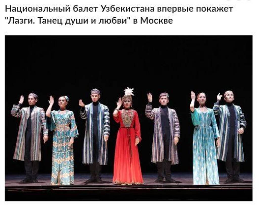 Издание информирует читателей о том, что 10 сентября на исторической сцене Большого театра при поддержке Фонда развития культуры и искусства Узбекистана гостям и жителям Москвы будет представлен балетный спектакль «Лазги. Танец души и любви».